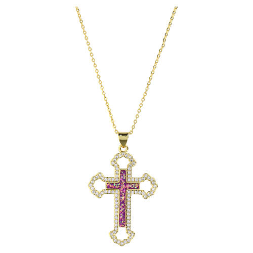 Collana con croce a pendente dorata con strass ametista.