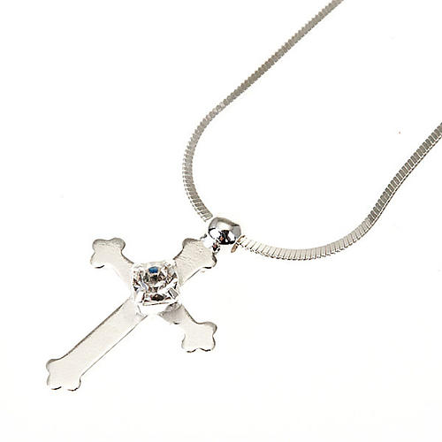 La croce trilobata è di piccole dimensioni e nel centro presenta uno strass bianco.