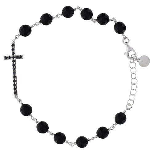 Bracciale grani onice croce zirconi neri Benedictus argento 925 rodiato.