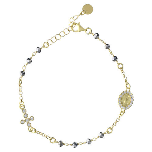 Bracciale in argento 925 bagno oro, con grani in ematite dal taglio brillante da 4 mm, croce con zirconi bianchi e Medaglia Miracolosa con cornice di zirconi incastonati.