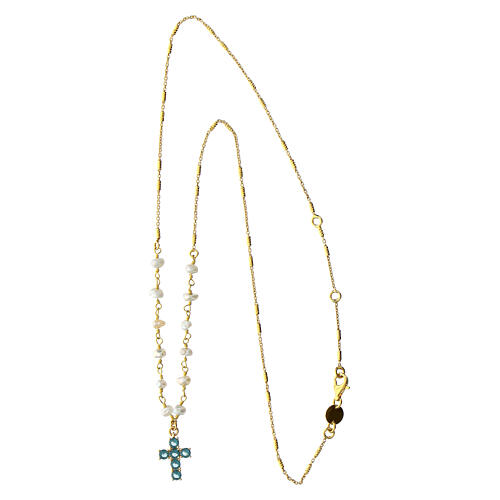 La collana è realizzata con argento 925 placcato in oro e perle scaramazze bianche. La croce è decorata da zirconi blu.
