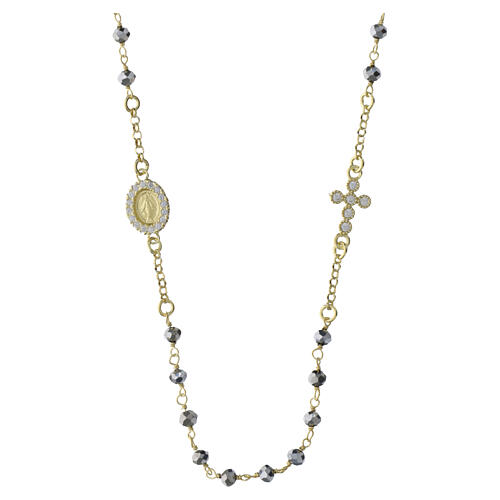 Collana girocollo con grani in ematite grigio argento dal taglio sfaccettato, di diametro 4 mm. Lungo la catena si trova una croce con zirconi bianchi e una Medaglia Miracolosa con cornice tempestata di zirconi bianchi brillanti.
