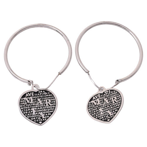 Coppia di orecchini in argento sterling rodiato, con cerchi di diametro 30 mm e pendente a cuore 2x2 cm. Sul pendente dal fondo brunito è inscritto in rilievo l'Ave Maria in latino.