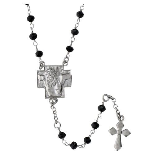 Rosario gioiello in argento 925 dalla finitura al rodio resistente allo scurimento, con grani in cristallo nero lucido da 3 mm. La crociera è costituita da una medaglia a forma di croce con rilievo di Cristo crocifisso.