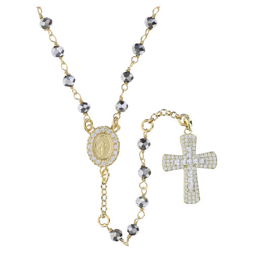 Rosario in argento 925 bagno oro con grani in ematite grigio argento dal taglio sfaccettato, di diametro 4 mm. La crociera è a forma di Medaglia Miracolosa con cornice tempestata di zirconi bianchi brillanti. La croce pendente, di dimensioni 18x15 mm, presenta un pavé di zirconi bianchi con una croce a rilievo centrale formata da zirconi più grandi.