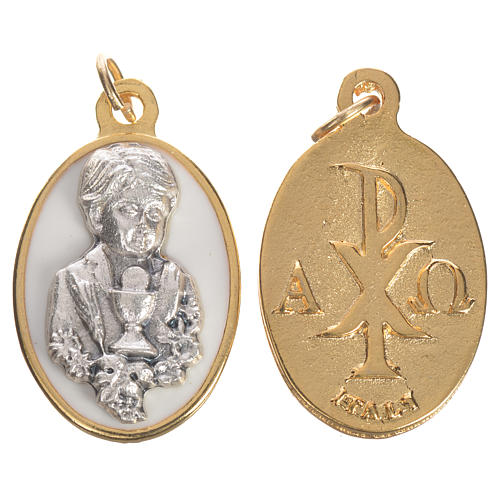 Medaglia Bimbo comunione in metallo con smalto bianco, altezza 2,2 cm.