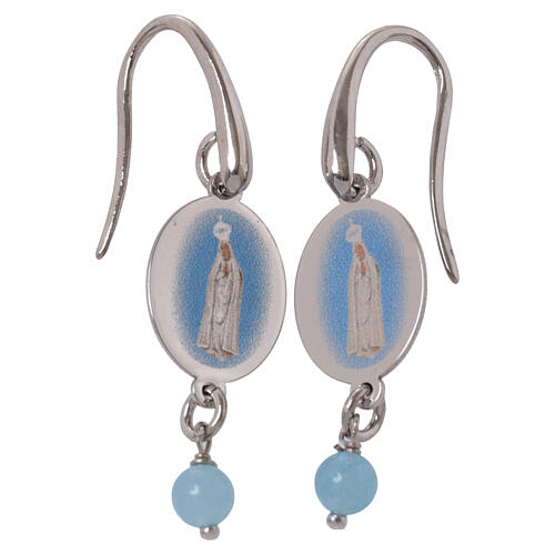 Orecchini in ottone rodiato Madonna di Fatima pendenti con gemma angelite celeste