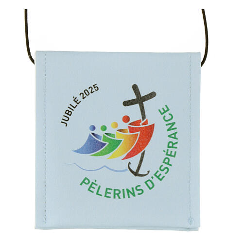 Portateca ad astuccio con due tasche, raffigurante il logo ufficiale del Giubileo 2025 pellegrini di Speranza in lingua francese, in stampa a colori. Questo astuccio portateca presenta due tasche per teche eucaristiche di diametro 5-5,5 cm, ed è dotato di cordino per essere portato al collo, di lunghezza circa 1 mt.
