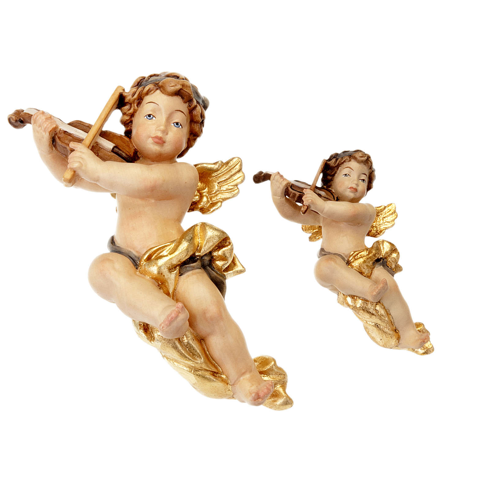 Angelo con violino in legno e doratura, realizzato e dipinto a mano.