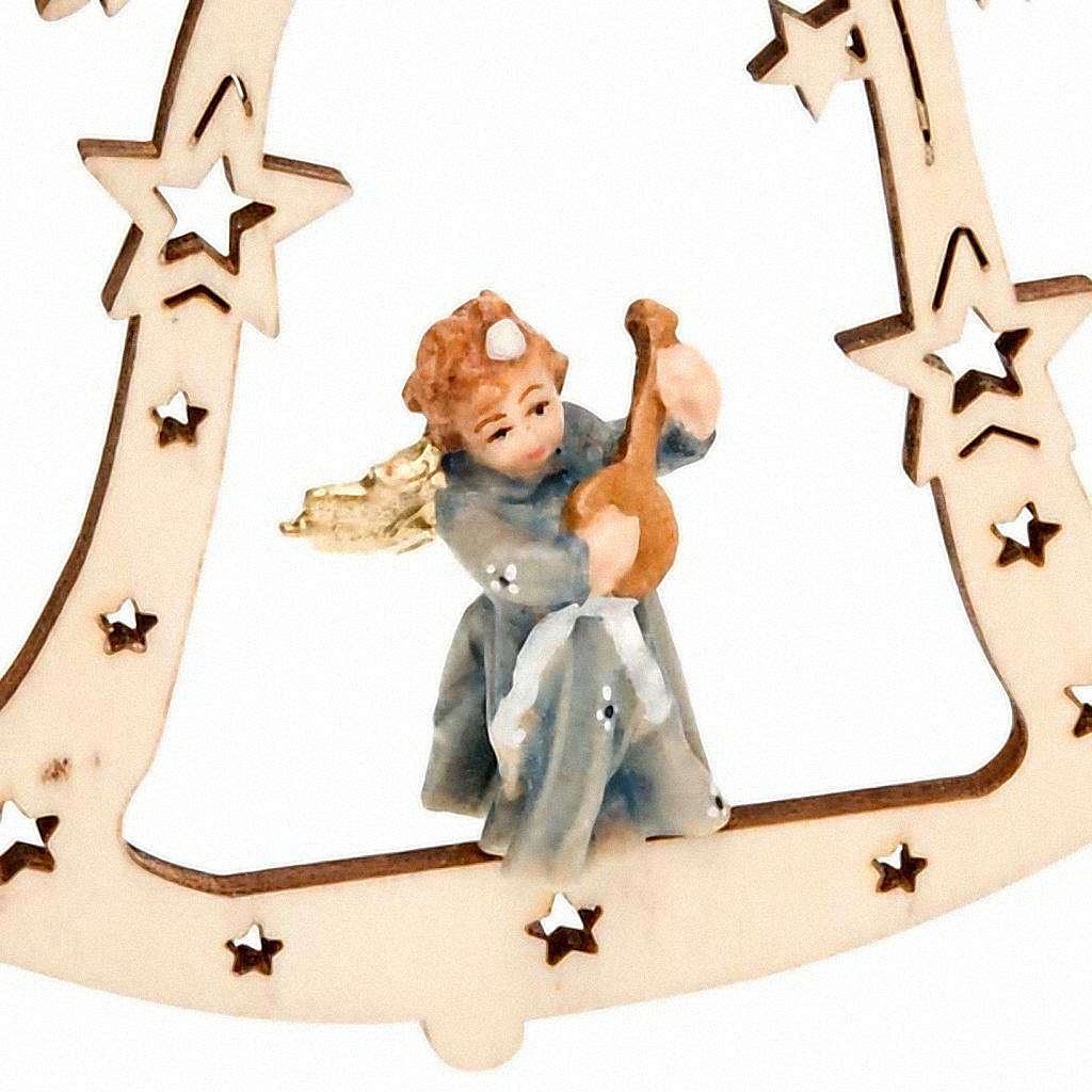 Angioletto in legno finemente rifinito, dipinto a mano e montato su campana intagliata con stelle e rami di vischio.