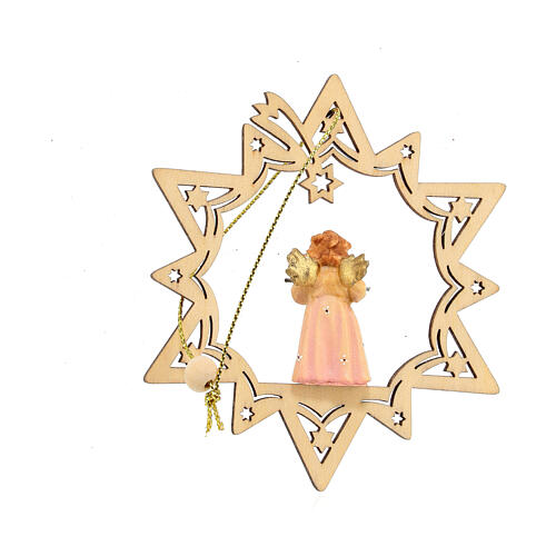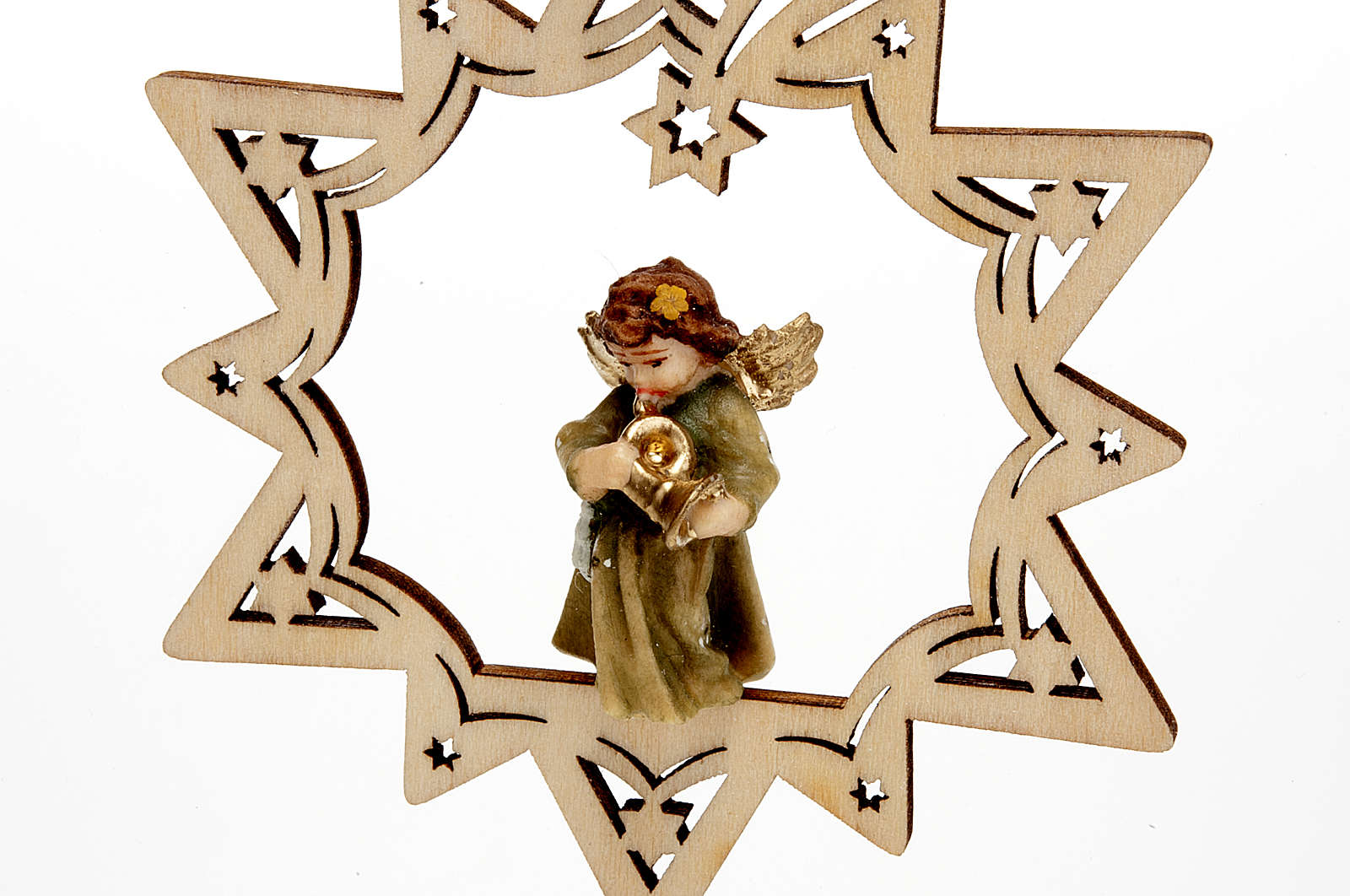 Angioletto in legno dipinto a mano, fissato su una stella intagliata con stella cometa e piccole stelle .