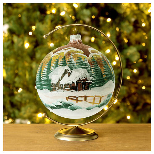 Palla in vetro soffiato 150 mm, base bordeaux con paesaggio, decorazione decoupage.