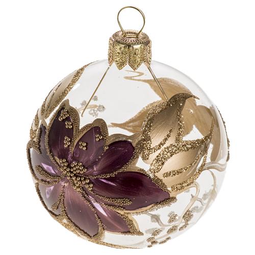 Palla Natale vetro trasparente con fiore fucsia oro 6 cm di diametro.