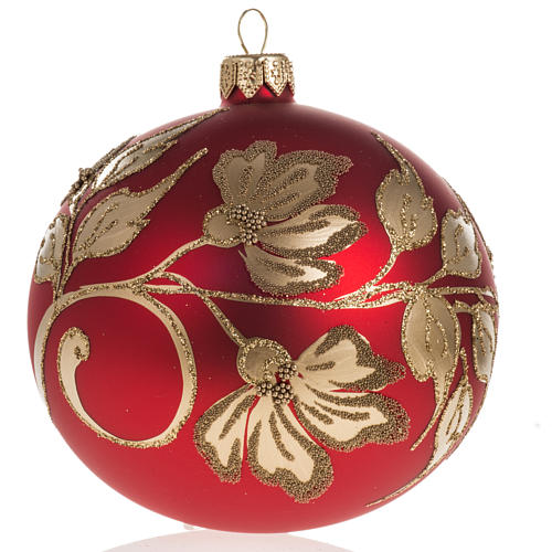 Pallina albero di Natale rossa in vetro soffiato. Ha decori artistici con glitter dorato, è di diametro 10 cm.