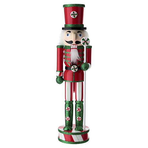 Schiaccianoci natalizio in legno con bastone di zucchero decorativo e uniforme rosso verde glitterata.
