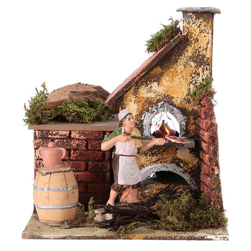 Ambientazione con pizzaiolo per presepe+ 10 cm in movimento e con lampada effetto fiamma.