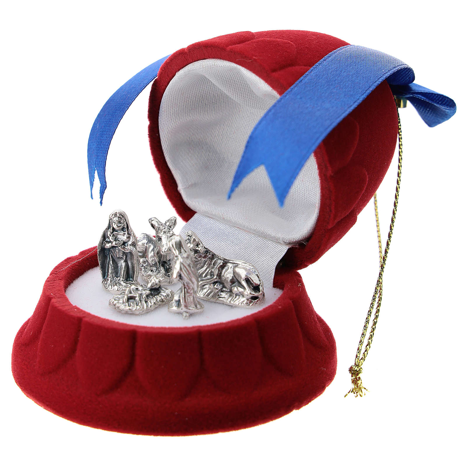 Cofanetto a forma di campana realizzato con velluto rosso e natività in metallo.