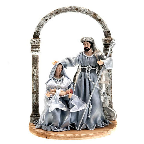 La natività è formata da 3 statuette di resina, vestite in stoffa color argento e particolari molto luminosi:
