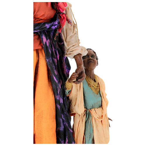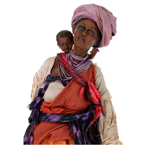 Donna mora con bimbo per mano, statua in terracotta per presepe da 30 cm. La statua è realizzata presso l'atelier artistico di Angela Tripi, in Sicilia.