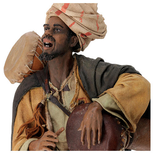 Il tamburaio prova a suonare il suo rullante e gira lo sguardo intorno per capire la reazione della gente. I lineamenti del volto raccontano la sua curiosità ma anche la sua attenzione.
