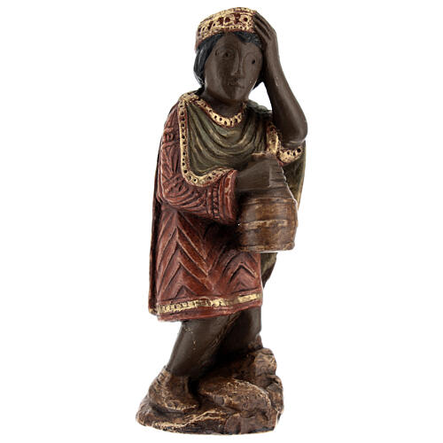 Re Magio africano con doni, statua del presepe d'Autunno dipinto. Statua policroma, dipinta a mano, di misure reali 12,5x4,5x4,5 cm.