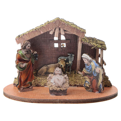 Presepe legno 5 cm con capanna e Sacra Famiglia stampata.