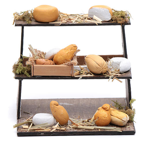 Banco di formaggi disposti su tre piani, accessorio per presepe fai da te di 8x9,80x10 cm.
