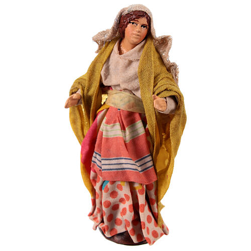 Statuina del presepe napoletano raffigurante una donna con le braccia aperte, prodotta a mano in terracotta.