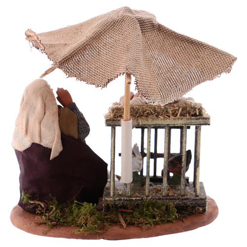 Donna con uova seduta 10 cm, statua in terracotta vestita del presepe napoletano.