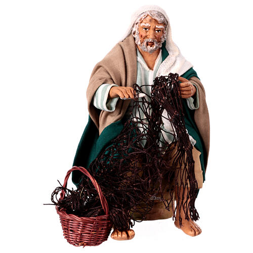 La statuina ritrae un pescatore seduto intento a filare la sua rete da pesca. Il pescatore è fatto di terracotta ed è curato nei minimi dettagli, infatti viene realizzato dalle abili mani di esperti presepisti napoletani secondo l'antica tradizione presepiale napoletana. La statuina è dipinta a mano e le stoffe con cui sono stati realizzati i vestiti sono accuratamente selezionate, colorate e sagomate sulla figura del pescatore. La disponibilità limitata dei tessuti e la lavorazione artigianale rendono ciascuna statuina sempre differente e quindi, a suo modo, sempre unica, per questo motivo la statuina che riceverete potrebbe essere leggermente diversa da quella in foto.