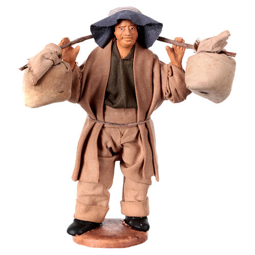 Statua realizzata in stile presepe napoletano raffigurante un uomo in posizione eretta che porta due sacchi legati a un bastone. L'uomo è realizzato in terracotta, ha vestiti in stoffa colorata ed è dipinta a mano. La statuetta rappresenta un pezzo unico realizzato da esperti presepisti napoletani