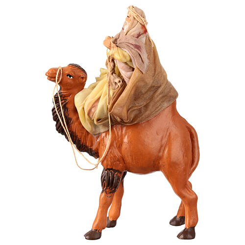 Questa statuina rappresenta un Re Magio su cammello, con le braccia aperte, realizzata in terracotta da artigiani presepisti di Napoli. L'attenzione al dettaglio è evidente nella cura manuale dei tratti del volto e nelle finiture del cammello, rendendo ogni pezzo distintivo e ben rifinito.
