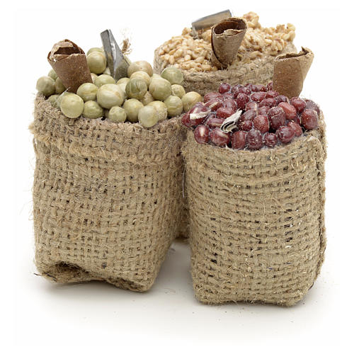 Minuteria per presepe fai da te realizzata a mano in Italia, a Napoli. Il sacco è realizzato in vera juta, con cibo in terracotta dipinta.
