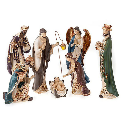Presepe in resina di 8 pezzi con statuette di cm 33 in resina dipinte a mano con decori dorati in rilievo.