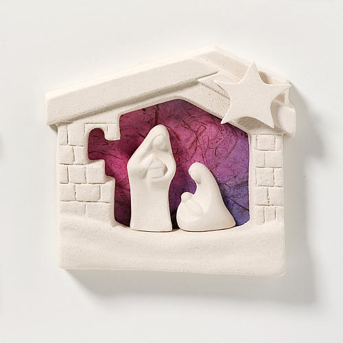 Presepe casetta Natale da parete, argilla bianca e viola.