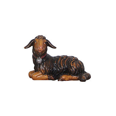 Agnello nero sdraiato testa a sinistra presepe Mahlknecht legno dipinto 12 cm Val Gardena.