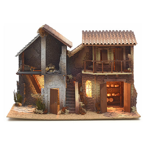 Prodotto artigianale davvero unico nel suo genere, assai curato nell'interno. La cucina al primo piano presenta mobilio accurato (ripiani di legno con formaggi). L'ampia gamma di spazi al piano terreno, al primo piano, lungo le scale e nel cortile esterno consento l'apposizione di numerose figure: nell'interno fino a max. cm 16/17 di altezza. Si poteva forse aggiungere una luce anche nel solaio, data la cura dei particolari del legname o della scala in legno e la "texture" del muro interno.