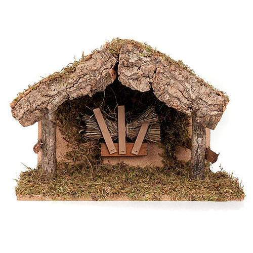 La capanna per presepe è le legno e sughero col tetto e la base ricoperti di muschio, contenente all'interno la mangiatoia con paglia.