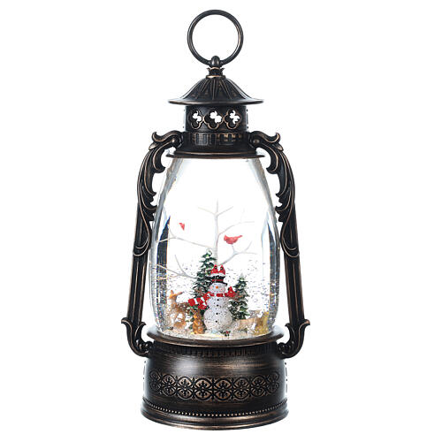 La lanterna in bronzo anticato con interno un allegro pupazzo di neve illuminato da luci LED bianco caldo.