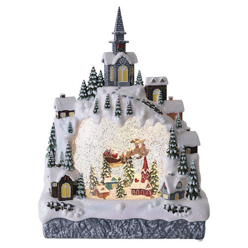 Villaggio natalizio decorativo con paesaggio innevato con Babbo Natale sulla slitta e effetto glitter in movimento.