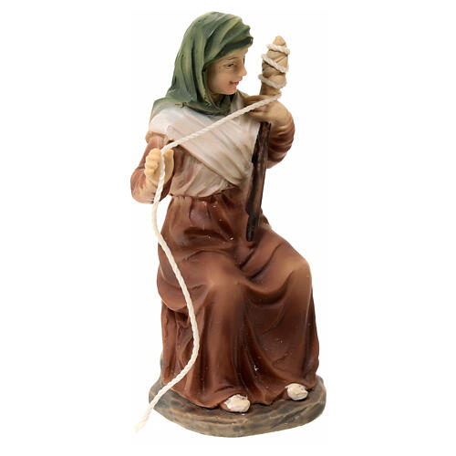 Statua per presepi di altezza 11 cm, raffigurante una filatrice con vero filo e matassa. Questa statua è in resina dipinta.
