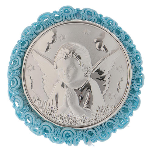 Sopraculla con medaglione in bilaminato argento poggiato su tessuto rifinito con passamaneria.