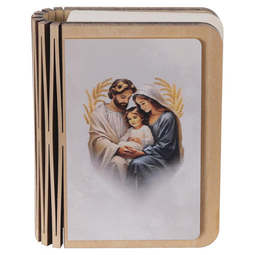 Bomboniera a forma di libro LED ricaricabile con decorazione raffigurante la Sacra Famiglia sul fronte.