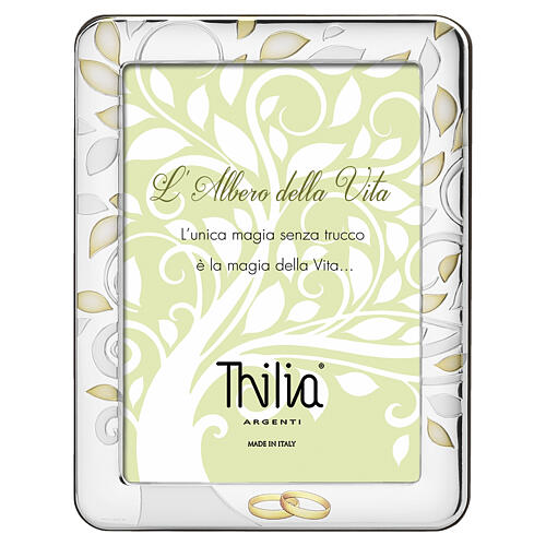 La superficie frontale è arricchita da foglie stilizzate in rilievo bianche con dettagli dorati e simbolo inferiore con due fedi nuziali dorate su sfondo bianco.