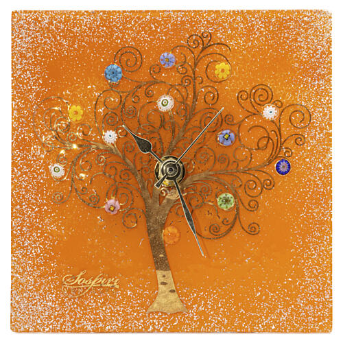 Orologio da tavolo quadrato murrine vetro Murano Albero della Vita arancione 10x10cm