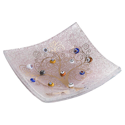 Piattino con murrine in vetro di Murano, colorazione rosa tenue, decorato con Albero della Vita in oro zecchino, formato quadrato da 9x9 cm.