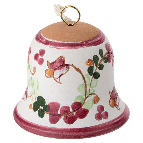 Campanella in terracotta smaltata con decoro floreale nei toni del rosa, verde e rosso, dipinta a mano e realizzata in Italia secondo tecnica artigianale tradizionale.