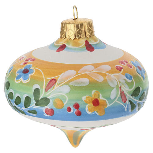 Pallina decorativa a trottola in terracotta smaltata con motivo floreale policromo dipinta a mano e realizzata in Italia.