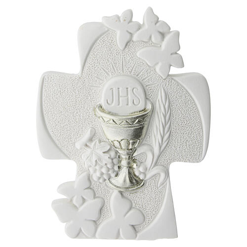Bomboniera in resina raffigurante croce con simboli della Prima Comunione in rilievo, indicata per celebrazioni eucaristiche e ricorrenze religiose.