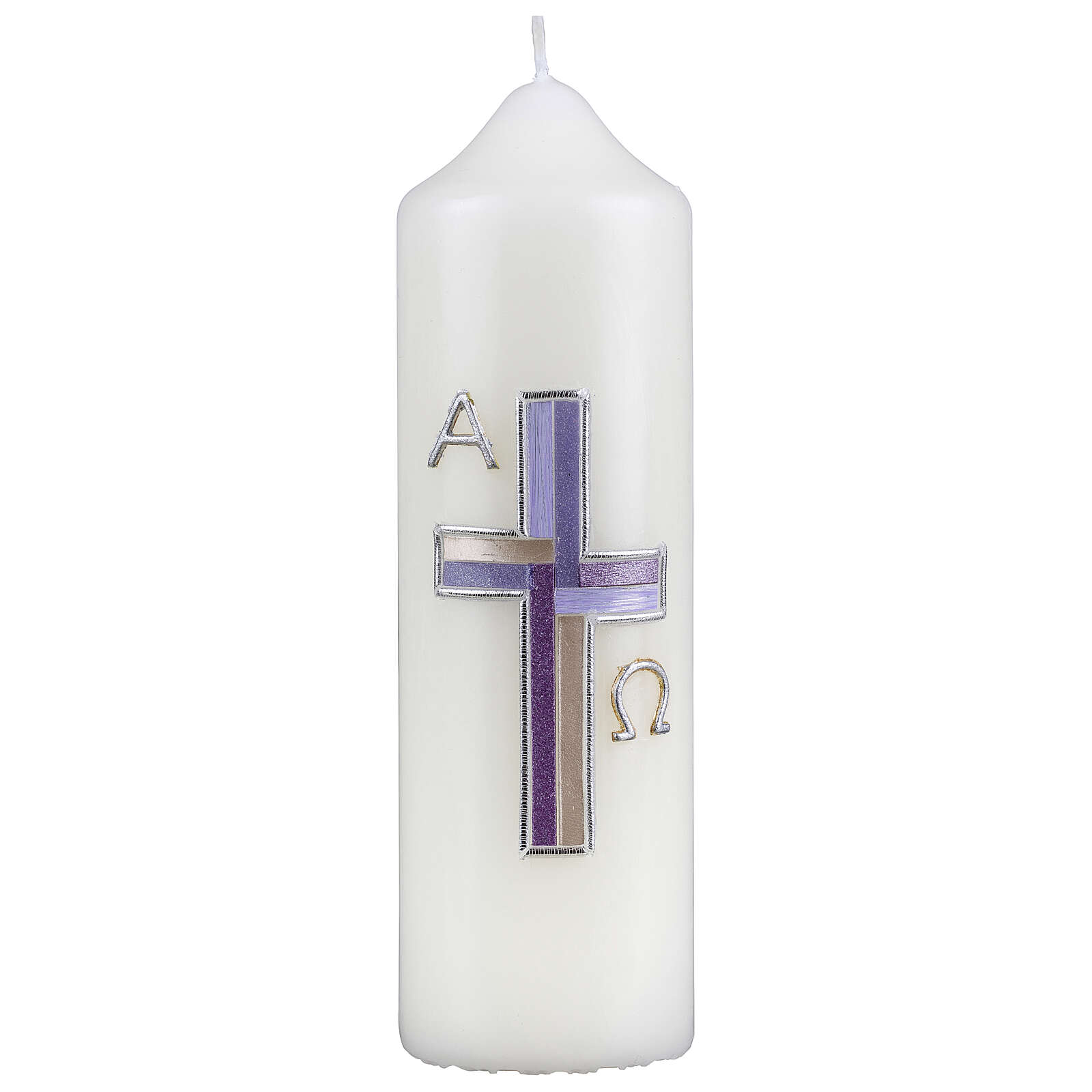 Questa candela è realizzata in cera bianca ed è decorata sul fronte da una croce dai bordi argento e interno in diverse sfumature di viola. Ai lati si trovano i simboli argentati di Alfa e Omega.